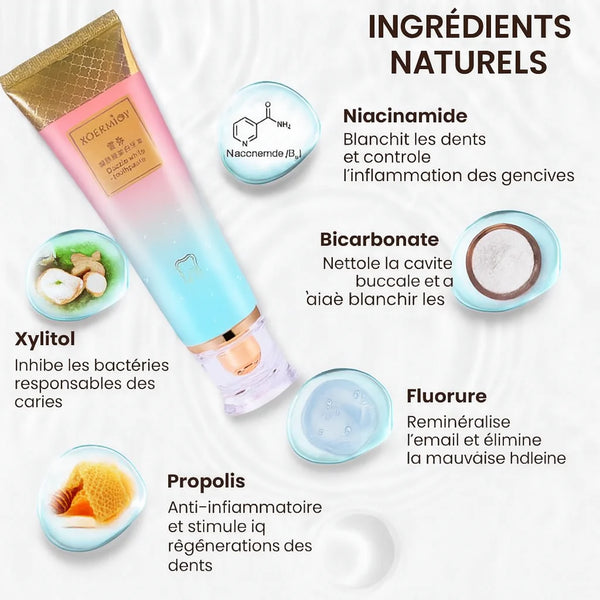 « Je souffrais depuis longtemps de l’accumulation de tartre, de caries et d’une mauvaise haleine persistante. C’était vraiment un calvaire et cela affectait ma confiance. Sur recommandation, j’ai décidé d’essayer le dentifrice blanchissant au Niacinamide. Les résultats ont été incroyables. Après avoir appliqué le dentifrice sur mes dents et l’avoir laissé agir quelques minutes avant de rincer, j’ai immédiatement senti la mousse travailler activement à éliminer le tartre, laissant mes dents incroyablement lisses et propres. Ce dentifrice est désormais devenu un indispensable de ma routine quotidienne, et je suis ravie de l’impact positif qu’il a eu sur ma santé bucco-dentaire. » Béatrice E.